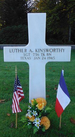 Sgt Luther A. Kinsworthy was a miner employed by the Civilian Conservation Corps, before he enlisted in Houston, Texas on 18 March 1941.From November 1944 to December 1944 he was hospitalized for wounds, sustained when his vehicle hit a landmine. He returned to his unit after he recovered.
