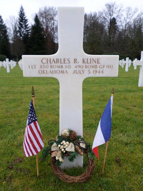 1st Lt Charles R. Kline attended college and was a salesman before he enlisted in Oklahoma City, Oklahoma on 21 July 1942.The aircraft was shot down by an Me-110 night fighter approximately 35 miles south of Paris on the morning of 5 July. It exploded and crashed at 0200hrs at a spot known locally as Les Trois Mares in Lagny-Le-Sec, France.