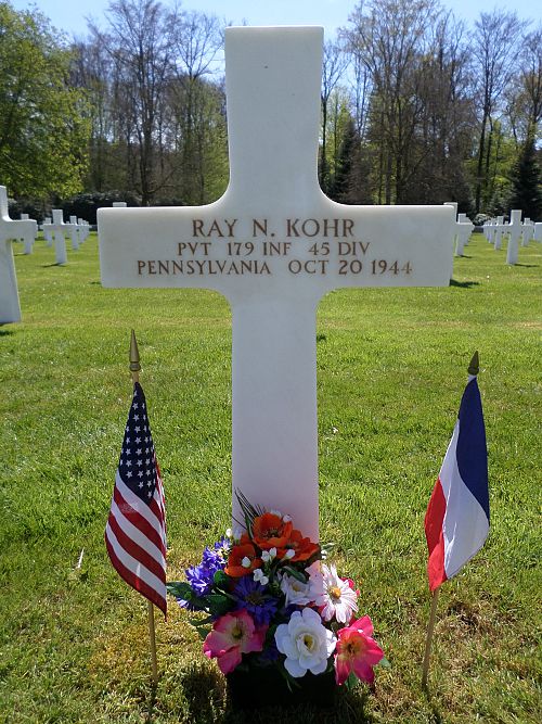 Pvt Ray N. Kohr attended high school for 4 years before he enlisted in Allentown, Pennsylvania on 30 December 1943.Source of information: Peter Schouteten, www.abmc.gov, www.wwiimemorial.com, www.archives.gov – WWII Enlistment Record, www.ancestry.com - Headstone and Interment Record / Pennsylvania Veteran Compensation Application Files WWII / U.S. WWII Draft Cards Young Men / Kl Wynn Family Tree / 1920 Census, http://www.45thdivision.org, www.findagrave.com, www.newspapers.com – Elizabethville Echo Pennsylvania 14 December 1944