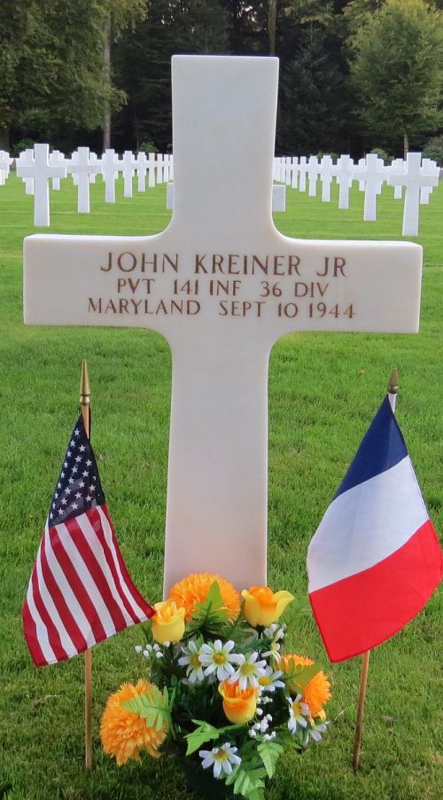 Pvt John Kreiner enlisted in Baltimore, Maryland on 5 November 1942.When approaching the little village of Sauvagney, Germans entrenched in the woods fired their machine guns across a meadow at the advancing Americans. Those who remember the day tell of screams across the meadow and medics running to assist the wounded with morphine and bandages. When the fighting ended, two men of E Company were dead.