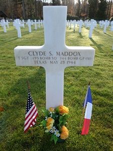 T/Sgt Clyde S. Maddox volunteered for the U.S. Army in San Antonio, Texas on 28 May 1942.The airplane was hit by flak just before bombs away sending the B-26 into a dive with one engine on fire. The bail out alarm was immediately sounded but only two of the crew survived. It crashed at 1145hrs on a house in the Rue Leon Desoyer at Saint-Germain-en-Laye, France, killing two civilians.
