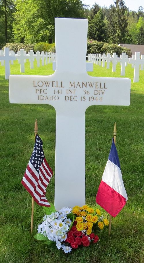 Pfc Lowell Manwell was employed at Fred & Kelly’s in Pocatello before he enlisted in Pocatello, Idaho on 12 November 1943.Source of information: Peter Schouteten, www.abmc.gov, www.wwiimemorial.com, www.archives.gov, https://36th-id.frb.io, https://texasmilitaryforcesmuseum.org/, www.ancestry.com - Headstone and Interment Record / Bernell Manwill Tree, www.findagrave.com – Albert Ledoux / Steele Kreis, www.newspapers.com – The Salt Lake Tribune - 23 January 1945