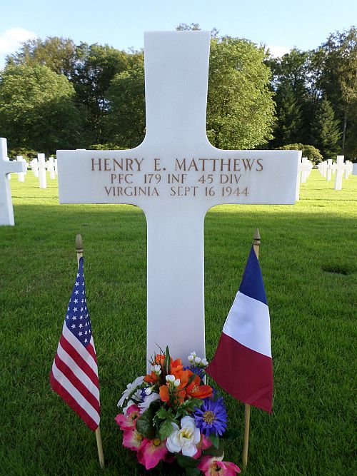 Pfc Henry E. Matthews enlisted in Richmond, Virginia on 7 May 1943.He was first buried at the Temporary American Military Cemetery in Saint-Juan, France.