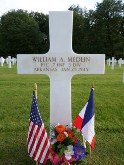 Pfc William A. Medlin was married to Mary Culpepper on 17 October 1942 and worked as a production operator.He enlisted in Little Rock, Arkansas on 12 August 1943.