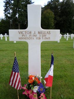 Pvt Victor J. Mellas worked on the family farm before he enlisted at Fort Snelling, Minnesota on 11 August 1944.He was killed by artillery shell fragments at his head.