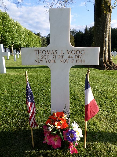 S/Sgt Thomas J. Moog attended high school for two years and was a sales clerk before he joined the National Guard in New York City, New York on 16 September 1940.He was killed by artillery shell fragments.