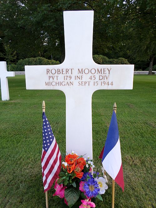 Pvt Robert Moomey was first buried at the Temporary American Military Cemetery in Saint-Juan, France.Source of information: Peter Schouteten, www.abmc.gov, www.wwiimemorial.com, www.ancestry.com - Headstone and Interment Record / Coulter Family Tree, http://www.45thdivision.org, www.findagrave.com – Barbara Parks