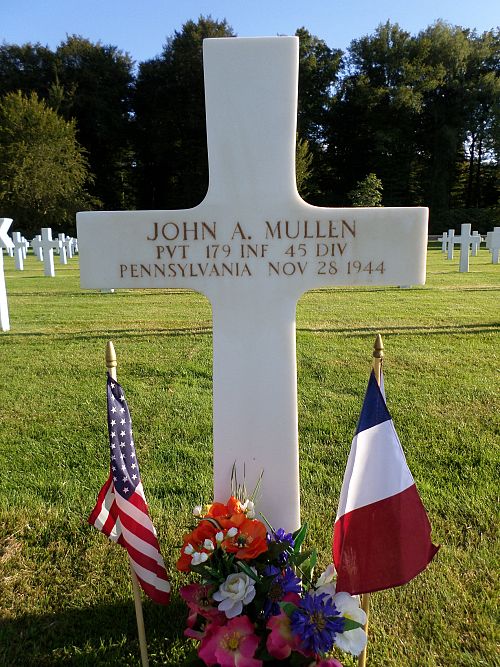Pvt John A. Mullen attended high school for 4 years before he enlisted in Altoona, Pennsylvania on 2 November 1943.Source of information: Peter Schouteten, Kathy McDermott, www.abmc.gov, www.wwiimemorial.com, www.archives.gov - WWII Enlistment Record, www.ancestry.com - Headstone and Interment Record / Pennsylvania Veteran Compensation Application Files WWII / 1930/1940 Census, http://www.45thdivision.org, www.findagrave.com - Russ Pickett