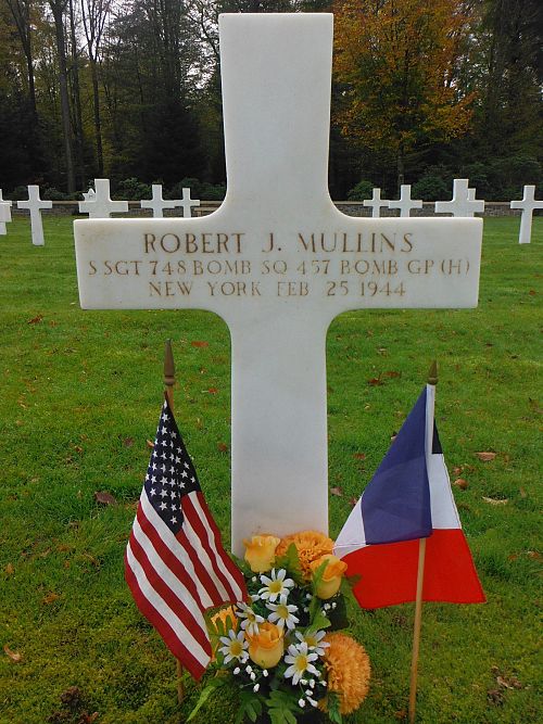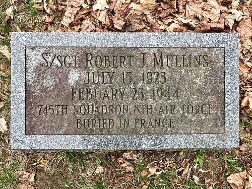 S/Sgt Robert J. Mullins graduated from Gloversville High School in June 1941 and worked as a bank teller before he enlisted in Utica, New York on 26 December 1942. He was transferred to the Army Air Corps in January 1943.The airplane was hit by flak over France and had to leave the formation. The pilot salvoed the bombs but was still not able to rejoin the formation and was attacked and shot down by fighter aircraft over Mont-Saint-Martin, France. Seven of his crew were killed, one evaded and two were taken prisoner.