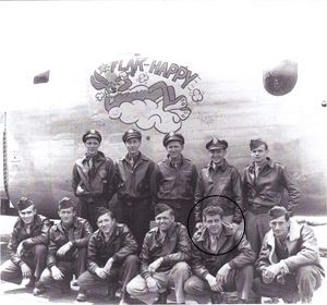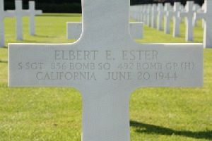 On 20 Jun 44, they led the group's low left squadron to bomb the heavily defended refineries at Politz. On the way to target just as they reached Rugen Island, they were attacked by enemy fighters. Kehoe recalls, "A loud explosion was my first indication that we had been hit. When I turned around the whole flight deck was in flames." His co-pilot left his seat to see if he could put the fire out. The whole plane was filled with smoke and for a time no one could see. Kehoe gave the order to bail but wasn't sure if the bell or intercom was working. As the smoke semi-cleared few minutes later, Kehoe discovered he was the only one left. Somehow Kehoe made it to Sweden. Elbert E. Ester died 20 June 1944 but his body was recovered on 6 Aug. 1944.Source of information: Kathy Tomlin, www.492ndbombgroup.com, www.wwiimemorial.com, www.archives.gov