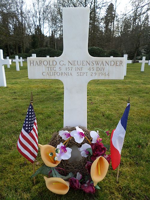 T/5 Harold G. Neuenswander attended high school for 3 years and was a checker before he enlisted in Los Angeles, California on 24 May 1943.He was first buried at the Temporary American Military Cemetery in Saint-Juan, France.