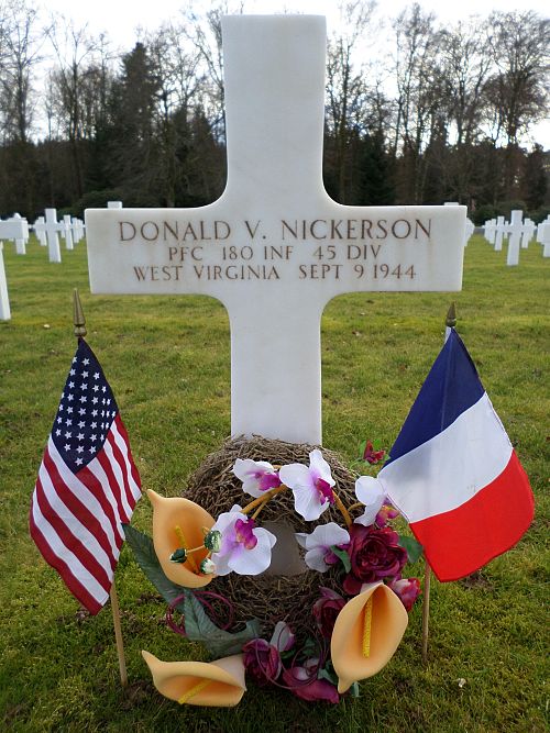 Pfc Donald V. Nickerson was a driver before he enlisted in Clarksburg, West Virginia on 4 May 1943.He was first buried at the Temporary American Military Cemetery in Saint-Juan, France.