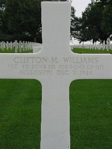 1st Lt Clifton M. Williams graduated from Moss Point High School and attended college. He was employed at International Paper Company.He joined the Air Corps of the U.S. Army Reserve at Keesler Field, Miloxi, Mississippi on 22 September 1942. He received his wings at Moody Field, Georgia in February 1944 and after further training at Chanute Field, Illinois, he was sent overseas.