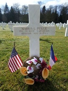 Pfc Marius L. Polge was first buried at Temporary American Military Cemetery Solers, France.Source of information: Peter Schouteten, Terry Hirsch, www.abmc.gov, www.findagrave.com – Terry Ruth, www.wwiimemorial.com, www.ancestry.com - Headstone and Interment Record / Backs Family Tree / WWII Draft Card