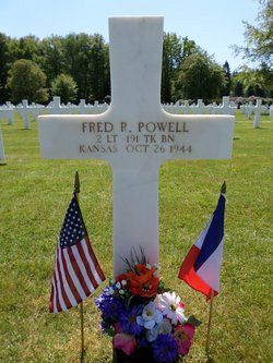 2nd Lt Fred R. Powell was a student at the University of Kansas when he enlisted on 21 February 1942.On 26 October 1944 in a wood in the vicinity of Housseras his tank was hit by an anti-tank shell, killing 2nd Lt Powel and Pvt Agapito Barraza, who is remembered on the wall of the missing at the Brittany American Cemetery in St. James, Normandy, France.
