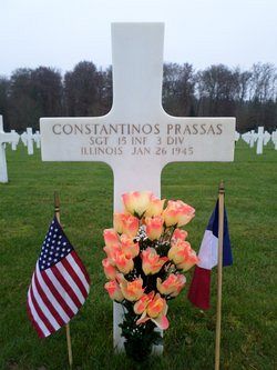Sgt Constantinos N. Prassas attended high school for three years and was a retail manager in his own shop before he volunteered for the Army of the United States in Chicago, Illinois on 5 February 1942.He was awarded a Silver Star Medal posthumously for his actions on the day he was killed by artillery shell fragments to his head.
