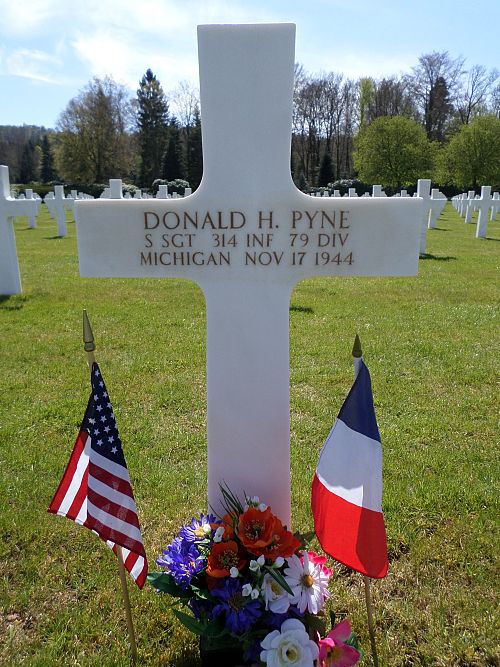 S/Sgt Donald H. Pyne attended high school for one year and was employed at the Chevrolet Motor Company before he enlisted in Detroit, Michigan on 9 April 1941.He was killed by artillery shell fragments in his shoulder.