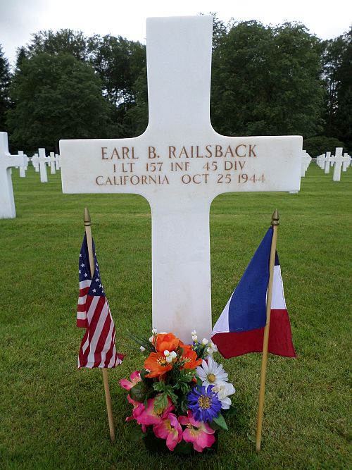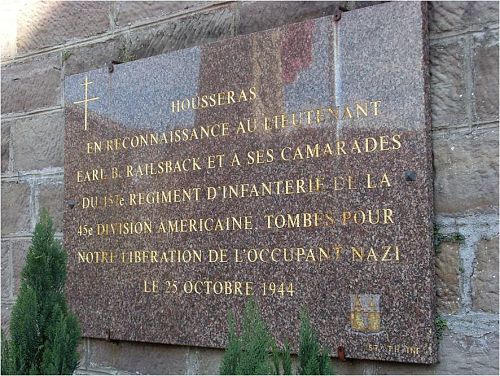 1st Lt Earl B. Railsback graduated from Whittier High School in 1936 and worked on a farm before he enlisted in Los Angeles, California on 24 January 1941.A memorial plaque honoring Lt Railsback and his comrades was erected at Saint-Pient church, Housseras. It reads: "In appreciation of Lieutenant Earl B. Railsbak and his comrades of the 157th Infantry Regiment of the 45th US Division. Fallen for our liberation from the Nazi occupation on 25 October 1944."