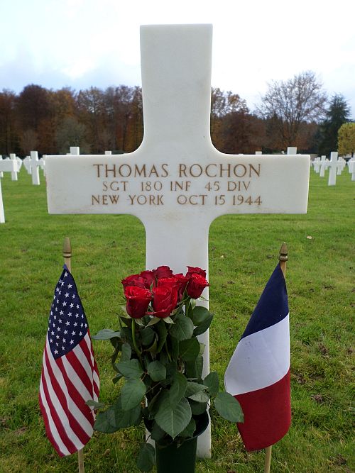 Sgt Thomas Rochon attended Albany High School and was employed at New York Power & Light Corporation.He enlisted in Albany, New York on 1 January 1943 and took part in the battles in North Africa, Sicily and southern France. He suffered severe bayonet wounds in the Sicilian campaign but was able to rejoin his unit at the front.