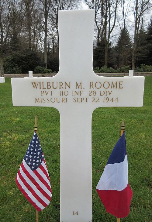 Pvt Wilbur M. Roome attended high school for three years before he enlisted in Jefferson Barracks, Missouri on 24 June 1943.He died in a hospital on 22 September 1944, of injuries received in combat on 16 September 1944.