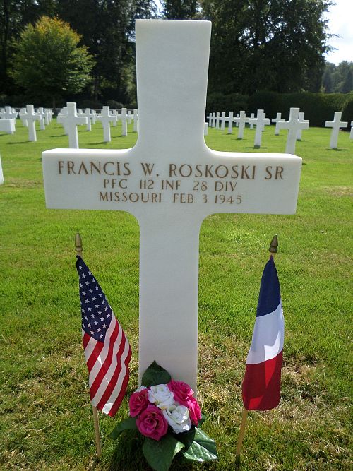 Pfc Francis W. Roskoski Sr. graduated from Central High School in 1937 and was employed as a jig maker for North American Aviation Corporation in Inglewood, California.He enlisted at Fort Leavenworth, Kansas on 7 July 1944 and was sent overseas in December 1944.