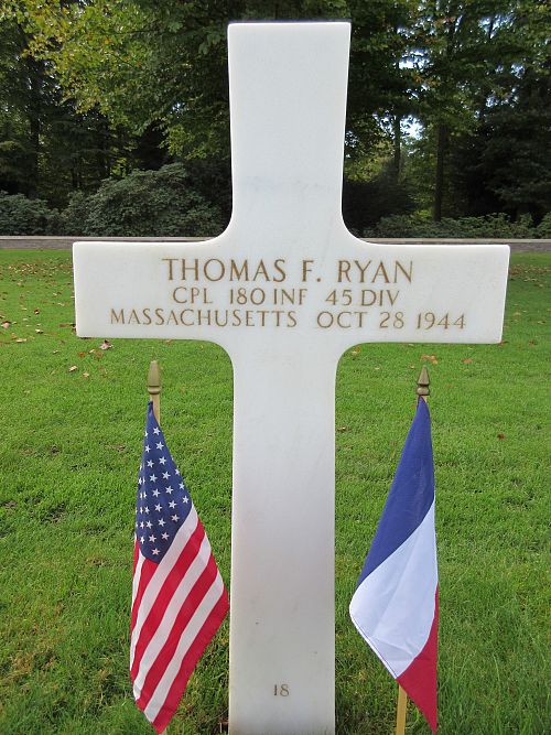 Cpl Thomas F. Ryan was a sales clerk before he enlisted in Fort Devens, Massachusetts on 12 April 1943.Source of information: Peter Schouteten, www.abmc.gov, www.wwiimemorial.com, www.archives.gov - WWII Enlistment Record, www.ancestry.com - Headstone and Interment Record / 1920 Census, http://www.45thdivision.org, www.newspapers.com – Fitchburg Sentinel Massachusetts 5 December 1944