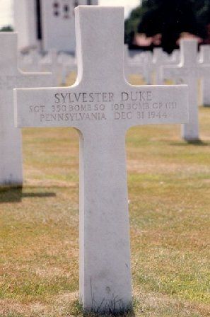 Sgt Sylvester Duke was a blacksmith before he joined the Air Corps of the U.S. Army Reserve in New Cumberland, Pennsylvania on 2 February 1944.The aircraft was hit by fighters after it left Hamburg and started the return flight home. The first group knocked out the oxygen and one of the engineers. Some of the crew had already left the ship when the aircraft went into a spin and the nose and a section of the side tore off. One of the crewmembers said that just before he bailed out he saw (Lt. Webster) helping Lt. Whitt out of the cockpit. Duke and Lakin stood in front of Richard Meehan to save him as he had no flak suit on. They got it and were killed right in front of him and he crawled out on his hands and feet over their dead bodies to get to the door. Then it wouldn't open, it was frozen. He wasn't able to walk so he made it to the other side of the ship and then bailed out. The sky was so thick with flak that you couldn't hardly see anything. The Germans met them that day with everything they had. So when Meehan left (Lt. Webster) was in the ship still, getting them all out and Whitt was then shot in the leg and Webster was putting his chute on Whitt. He said the ship went on fire just when he got out.... the way he told it, it was the 13th mission on New Year's Eve, and Webster had a place all hired for a big party for the crew when they got home that night." This information was provided by Anne Webster