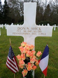 Pvt Don N. Shick was an inspector employed at the Carborundum Co., Niagara Falls, New York, before he enlisted in Kittanning, Pennsylvania on 19 November 1943.Source of information: Leo Minne, www.abmc.gov, www.wwiimemorial.com, www.ancestry.com - 1930/1940 Census / U.S. Headstone and Interment Record / U.S. WWII Hospital Admission Card Files / U.S. Draft Cards Young Men / Pennsylvania Veteran Compensation Applications, www.80thdivision.com