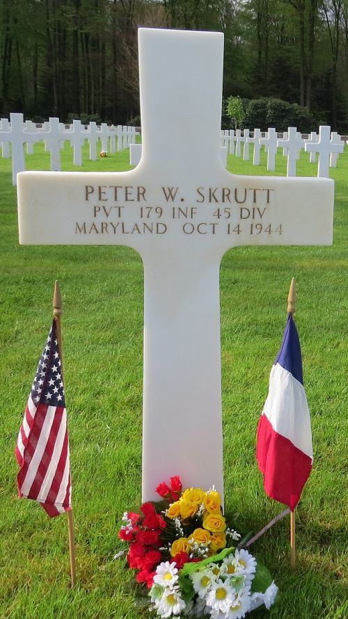 Pvt Peter W. Skrutt graduated from Northumberland High School in 1939 and attended Lincoln Welding Institute in Cleveland, Ohio. He was employed at Sparrow Point Shipbuilding yards in Baltimore.He enlisted in Baltimore, Maryland on 27 January 1943.