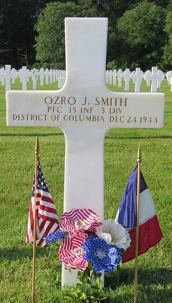 Pfc Ozro J. Smith attended high school for four years and was a draftsman, employed by the General Motors Corp.Source of information: Leo Minne, www.abmc.gov, www.wwiimemorial.com, www.ancestry.com – 1930/1940 Census / Headstone and Interment Record / U.S. Draft Cards Young Men / US WW2 Hospital Admission Cards, History 3rd Infantry Division WWII