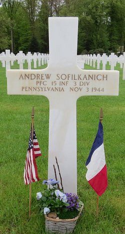 Pfc Andrew Sofilkanich was an ore dresser, employed by Bethlehem Steel Co. before he enlisted in Pittsburgh, Pennsylvania on 1 March 1943.In July 1944, in Italy, he was wounded by artillery shell fragments in the buttock and hip. He was discharged from medical care in November 1944.