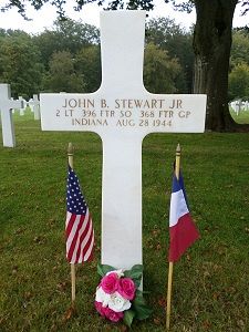 2nd Lt John B. Stewart was sent overseas in May 1944."Flying a P-47D he took off from Chartres, France on a dive-bombing operation to Meaux, France. After strafing enemy transport, the leader called to go home as all his ammunition had been expended. Lt Stewart called that he still had plenty of it left and got permission to strafe a staff car that they had missed. His P-47 hit a tree, could not gain altitude and crashed 0820hrs north of Betz, 17 miles north of Meaux."