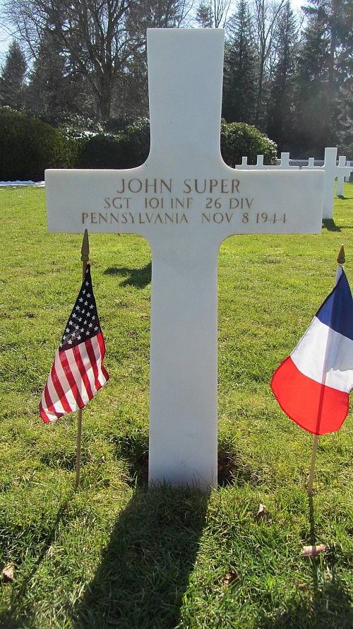Sgt John Super attended high school for one year and was a miner and mining-machine operator at Jeanesville Colliery before he enlisted at Fort George G. Meade, Maryland on 19 June 1941. He was sent overseas in August 1944.Source of information: Peter Schouteten, www.abmc.gov, www.wwiimemorial.com, www.archives.gov - WWII Enlistment Record, www.ancestry.com - Headstone and Interment Record / U.S. WWII Draft Cards Young Men / 1930 Census, www.findagrave.com - delancy / Silvano Theunissen, www.newspapers.com - The Plain Speaker 27 November 1944