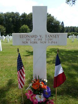 Pfc Leonard V. Tansey attended Watervliet High School and was a metal dipper.He enlisted in Albany, New York on 10 April 1943 and was sent overseas in September 1943 and participated in the invasion campaigns of North Africa and Sicily.