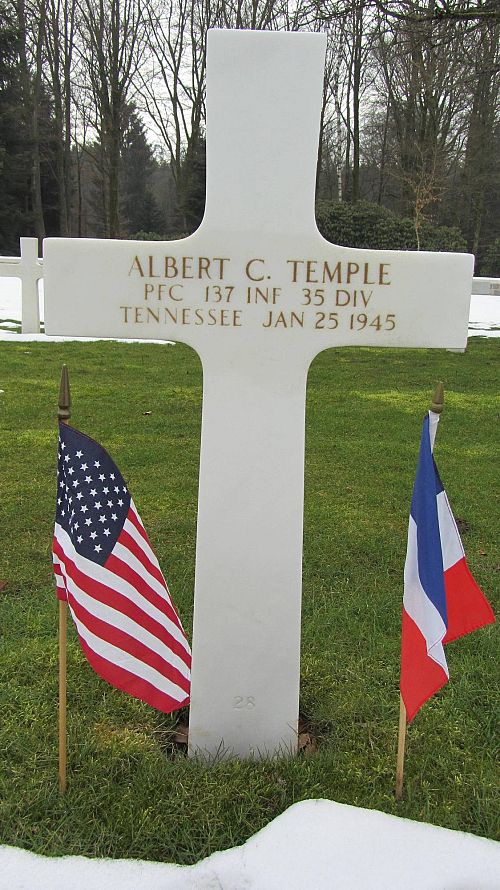 Pfc Albert C. Temple was employed as a butcher by C. Muller Grocery before he enlisted in Camp Shelby, Mississippi on 20 June 1944. He was sent overseas in November 1944.He was killed by artillery shell fragments to his leg.