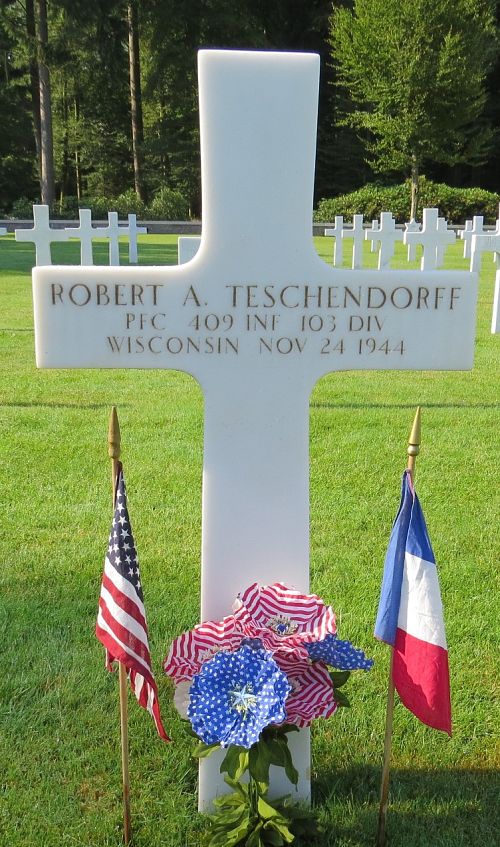 Robert Teschendorff was a September 1942 graduate of Washington High School and was employed at Milwaukee Road.Source of information: André Koch, www.abmc.gov, www.wwiimemorial.com, www.ancestry.com, - 1930/1940 Census, Headstone and Interment Records, http://103divwwii.usm.edu/409th-regiment.html, - Unit Journal for November 1944, The Milwaukee Journal - 2 April 1945, WWII Draft Card, The Milwaukee Journal - 2 April 1945, http://103divwwii.usm.edu/assets/mr-409-g-by-name.pdf ,
