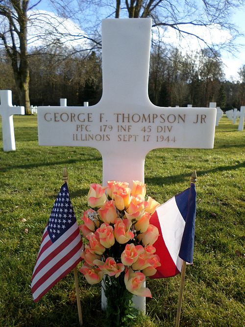 Pfc George F. Thompson Jr. was first buried at the Temporary American Military Cemetery in Saint-Juan, France.Source of information: Peter Schouteten, www.abmc.gov, www.wwiimemorial.com, www.ancestry.com, - Headstone and Interment Record / 1940 Census / Cook County Illinois Birth Certificates Index, http://www.45thdivision.org