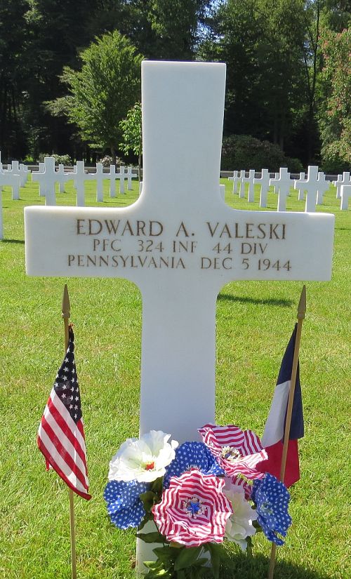 Pfc Edward A. Valeski was a painter before he enlisted in Harrisburg, Pennsylvania on 20 February 1943. He was sent overseas September 1944.Source of information: Peter Schouteten, www.abmc.gov, www.wwiimemorial.com, www.archives.gov – WWII Enlistment Record, www.ancestry.com - Headstone and Interment Record / U.S. WWII Draft Cards Young Men, www.findagrave.com – K Harned, www.newspapers.com – Shamokin News Dispatch Pennsylvania 21 December 1944