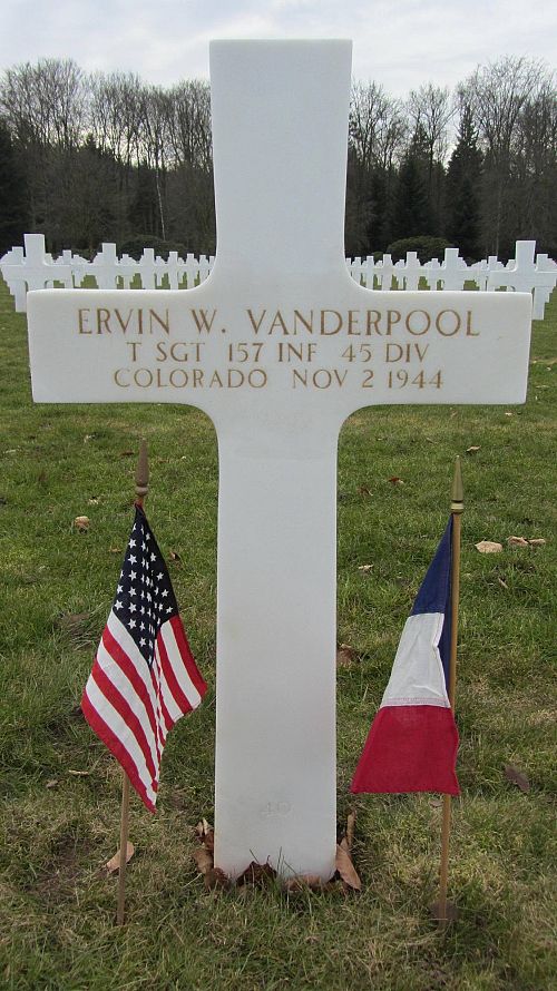 T/Sgt Ervin W. Vanderpool worked on a farm before he enlisted on 6 January 1941.He was awarded the Silver Star Medal a first time for his actions on 23 September 1943. The citation cited: "He was a rifleman in a squad engaged in a flanking attack against enemy positions in Italy. When an enemy vehicle approached his position, which was under fire from enemy machine guns, he killed the driver and six occupants with his rifle. He then crossed an open area under enemy machine gun fire to provide information which made possible the laying of accurate mortar fire on enemy forces which he had observed and to procure aid for his wounded squad leader. Upon his return to the squad he directed additional fire on the enemy which aided the company in taking its objective.