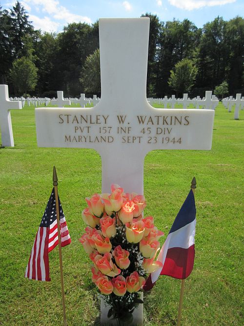 Pvt Stanley W. Watkins enlisted in Baltimore, Maryland on 1 December 1943.He was first buried at the Temporary American Military Cemetery in Saint-Juan, France.