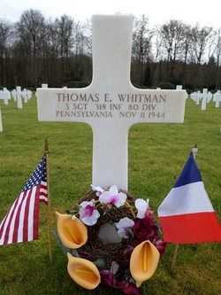 S/Sgt Thomas E. Whitman attended high school for four years and was a fireman before he enlisted in Altoona, Pennsylvania on 21 September 1942. He was sent overseas on 1 July 1944.He was awarded the Silver Star for gallantry in action while serving with the 80th Infantry Division in connection with military operations against an enemy of the United States on 2 October 1944, in France.