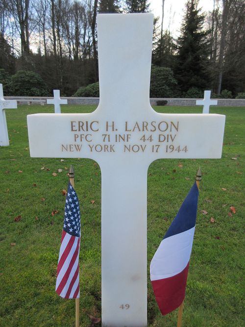 Pfc Eric H. Larson attended high school for four years and was employed by the B.M.T. Division of the New York City transit system before he enlisted at Camp Upton, New York on 5 March 1942. He was sent overseas in September 1944.Source of information: Peter Schouteten, www.abmc.gov, www.wwiimemorial.com, www.archives.gov - WWII Enlistment Record, www.ancestry.com - Headstone and Interment Record / 1930 Census / Connecticut Federal Naturalization Records, www.findagrave.com, www.newspapers.com - The Brooklyn Daily Eagle 19 December 1944
