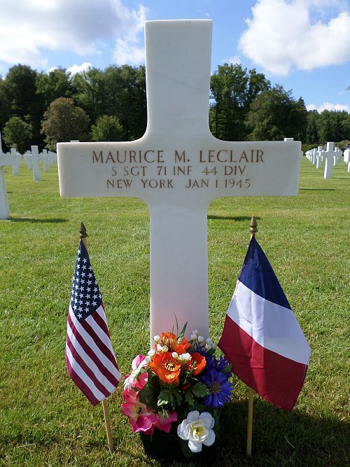 S/Sgt Maurice M. Leclair attended high school for four years and worked as a clerk before he joined the National Guard in New York City, New York on 16 September 1940.He was awarded the Distinguished Service Cross posthumously. The citation cited: On 1 January 1945 in the vicinity of Moronville Farms, France. Sgt LeClair, discovered an enemy attacking force approaching his company CP, which was only about 150 yards away. After calling for artillery, he left his position and ran in the direction of the approaching enemy. When about 30 yards from the enemy column, he jumped into a hole and opened fire with his sub-machine gun, killing or wounding eight of the enemy. While withdrawing to his platoon, he was wounded in the stomach by a German machine-pistol bullet. Nevertheless, he reached his platoon and continued to fight until he became too weak to continue. He died of his wounds at the Battalion aid station. Because of his intrepid gallantry and self-sacrifice, Sgt LeClair diverted and weakened the enemy attack enabling his company to defeat the superior enemy force.