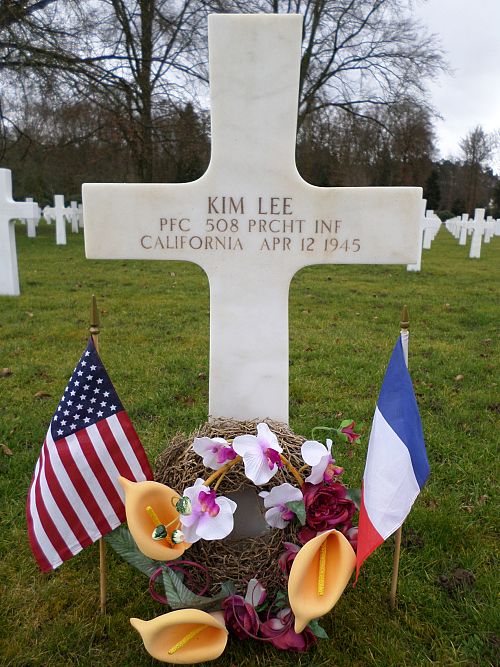 Pfc Kim Lee was a sales clerk before he enlisted in Los Angeles County, California on 9 December 1942.He died of injuries to his brain and chest, sustained as a passenger in a vehicle accident.