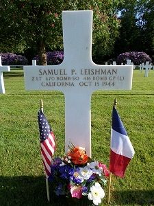 2nd Lt Samuel P. Leishman joined the Regular Army in Los Angeles, California on 15 June 1942.Pilot and crew were on a local formation training flight when bad weather moved in. Lt. Leishman struck a large tree while making an instrument descent. Leischman's plane was last seen near Sézanne, flying very low. He had evidently been trying to let down through the overcast. The plane was in a 30-degree dive when it struck a large tree on a hill-side in very hilly country. The pilot and his two gunners, Sergeants Joseph F. Siracusa and Eugene H. Shempren, were killed in the crash.