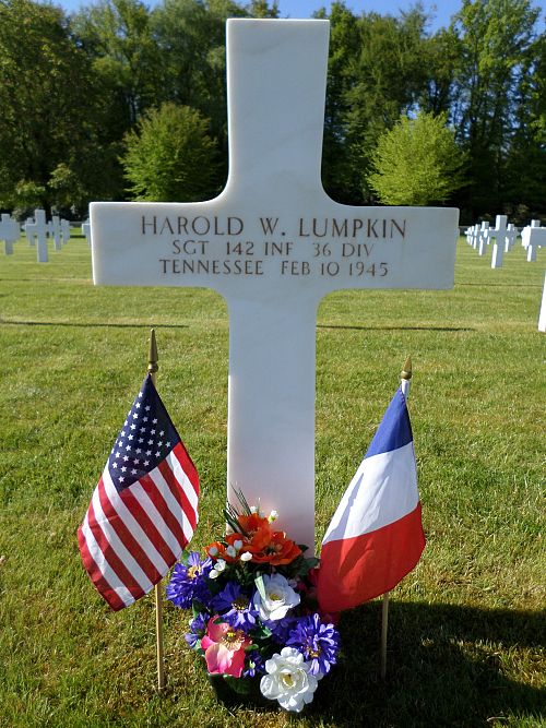 Sgt Harold W. Lumpkin attended Munford High School and worked on his father’s farm before he enlisted at Fort Oglethorpe, Georgia on 24 July 1943.Source of information: André Koch, www.abmc.gov, www.wwiimemorial.com, www.archives.gov – WWII Enlistment Record, www.ancestry.com - 1920/1930/1940 Census / Headstone and Interment Records / U.S. WWII Draft Cards Young Men 1940-1947, https://36th-id.frb.io/, 142ndaar-.pdf, https://valor.militarytimes.com/