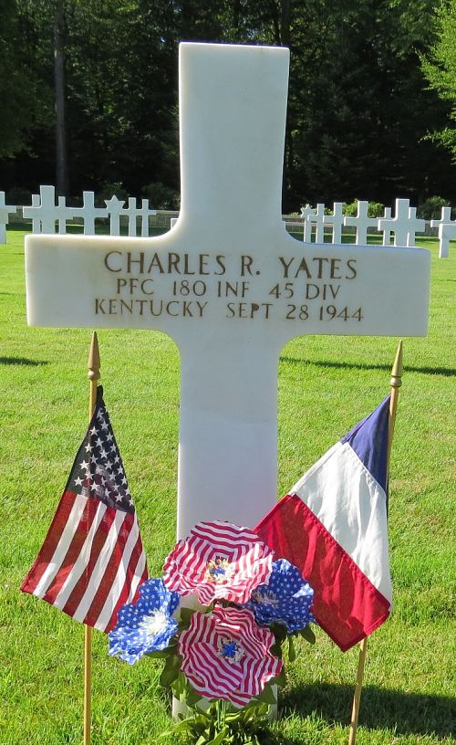 Pfc Charles R. Yates worked on a farm before he enlisted in Louisville, Kentucky on 2 February 1943.He died 28 September of wounds received in action in France, three days before, on 25 September 1944.