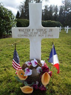 Pfc Walter P. Yeruc attended high school for two years and worked in the machine shop of the Schick Dra Schaver Co. before he enlisted in New Haven, Connecticut on 9 August 1943.In May 1944, in Italy, he was wounded in the arm and leg by artillery shell fragments. He was discharged from the hospital in July 1944.