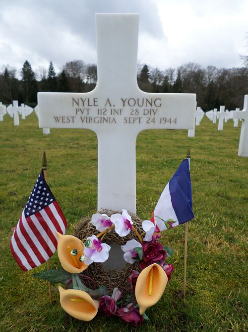Pvt Nyle A. Young attended high school for two years and worked by the South Eastern Gas Company before he enlisted at Fort Benjamin Harrison, Indiana on 5 January 1944.He was first buried at the Temporary American Military Cemetery in Solers, France.
