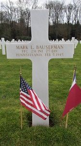 Pfc Mark L. Bauserman enlisted in Harrisburg, Pennsylvania on 5 January 1944 and received his training at Fort McClellan in Alabama; Camp Breckenridge in Kentucky and Camp Butner in North Carolina. He was sent overseas in October and had served in England, Belgium and France.He was employed at Cressler's fruit market and as a route-man for the Miller-Reed Dairy.